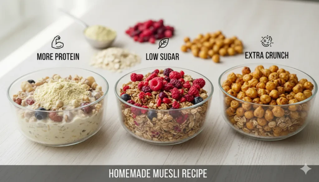 Overnight: soak ½ cup muesli in milk of choice, top with grated apple. Smoothie bowl: blend ½ cup muesli with frozen mango and Greek yogurt. Parfait: layer muesli, yogurt, and fresh berries. Each takes under two minutes. Athletes can batch five jars on Sunday for grab-and-go fuel all week.